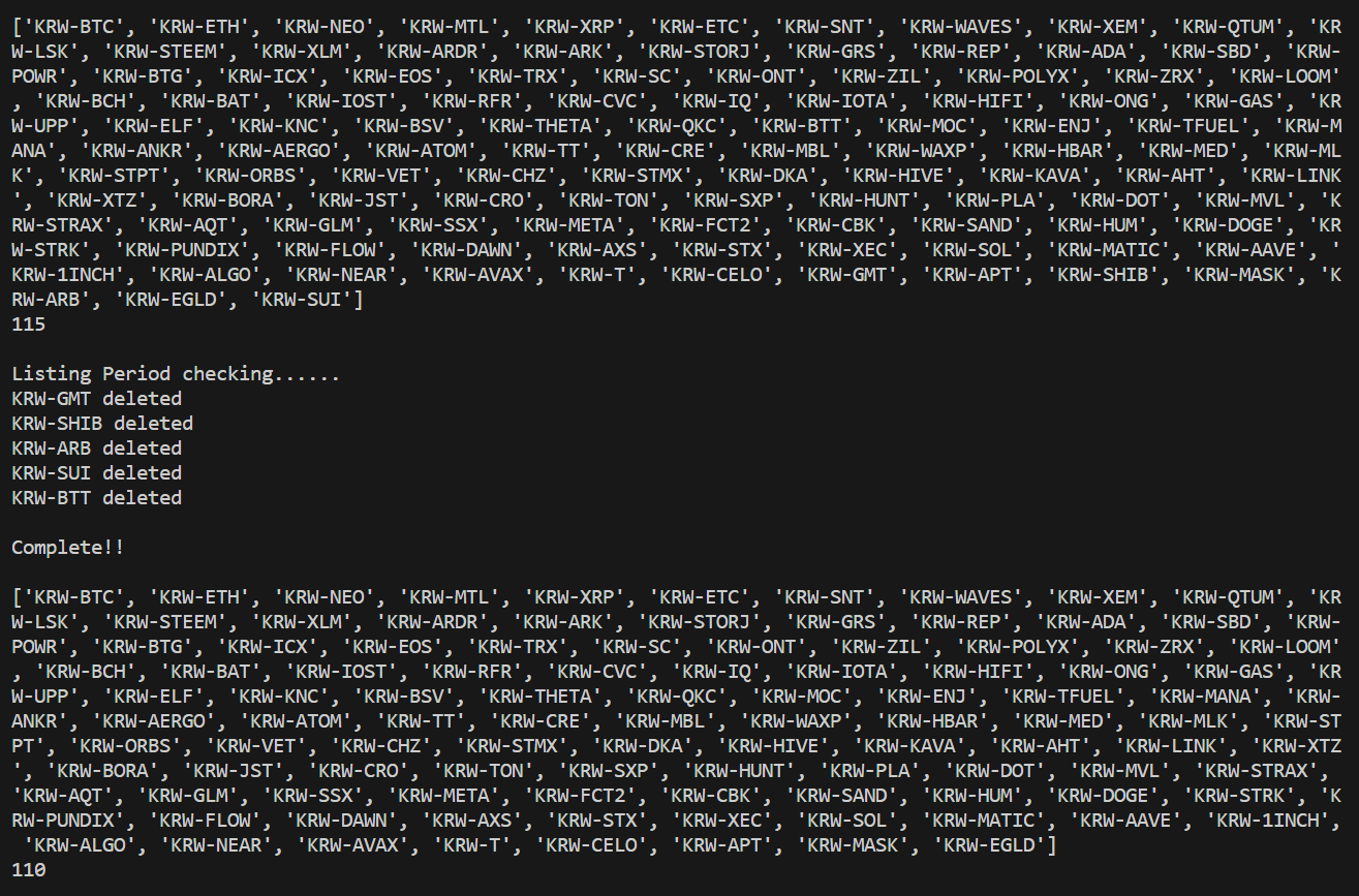 아래의 결과를 보면, 2023.05.20 기준으로 KRW 마켓에 총 115개의 코인이 상장되어 있고, 상장기간이 400일 이하인 코인 4종류와 호가 단위 큰 '비트토렌트(BTT)'를 포함해서 총 5종류가 제거되어, 최종 110종류의 코인이 리스트에 포함되어 있는 것을 확인할 수 있다.