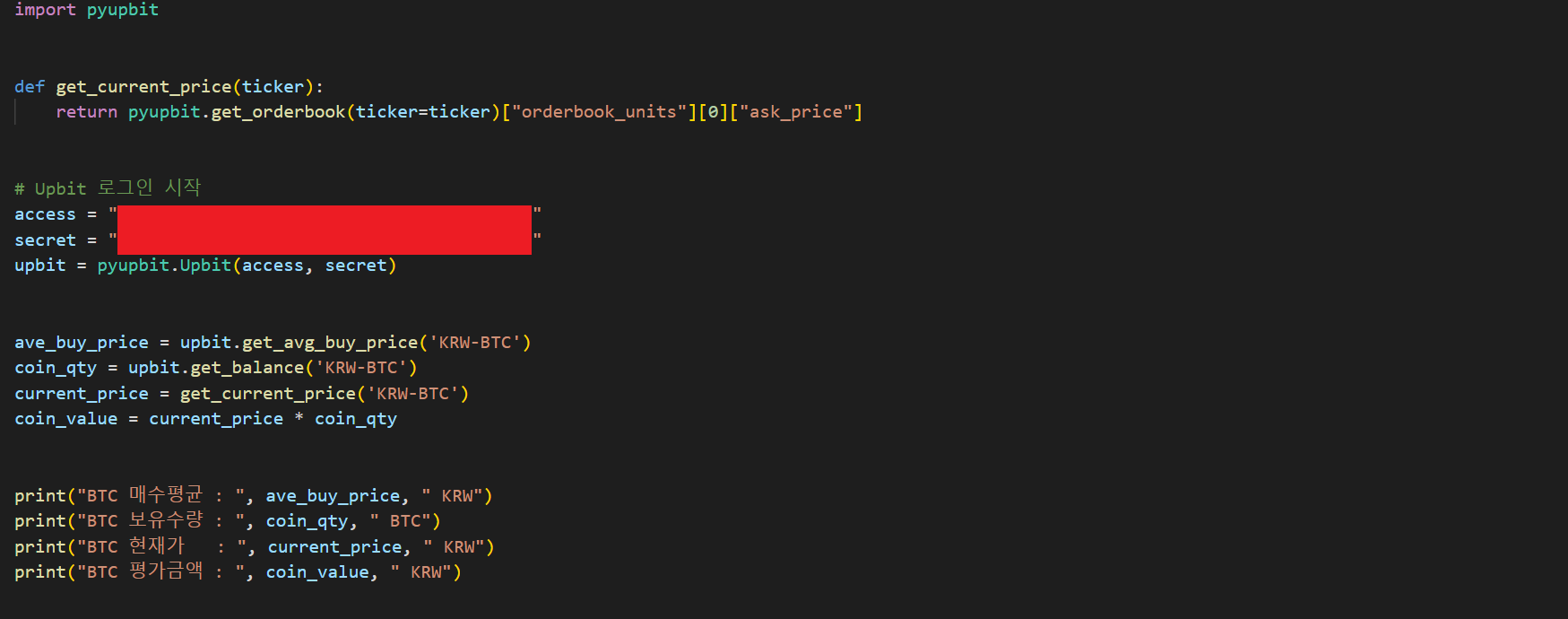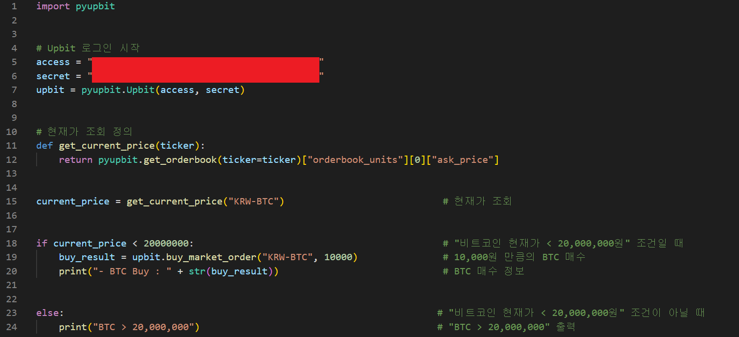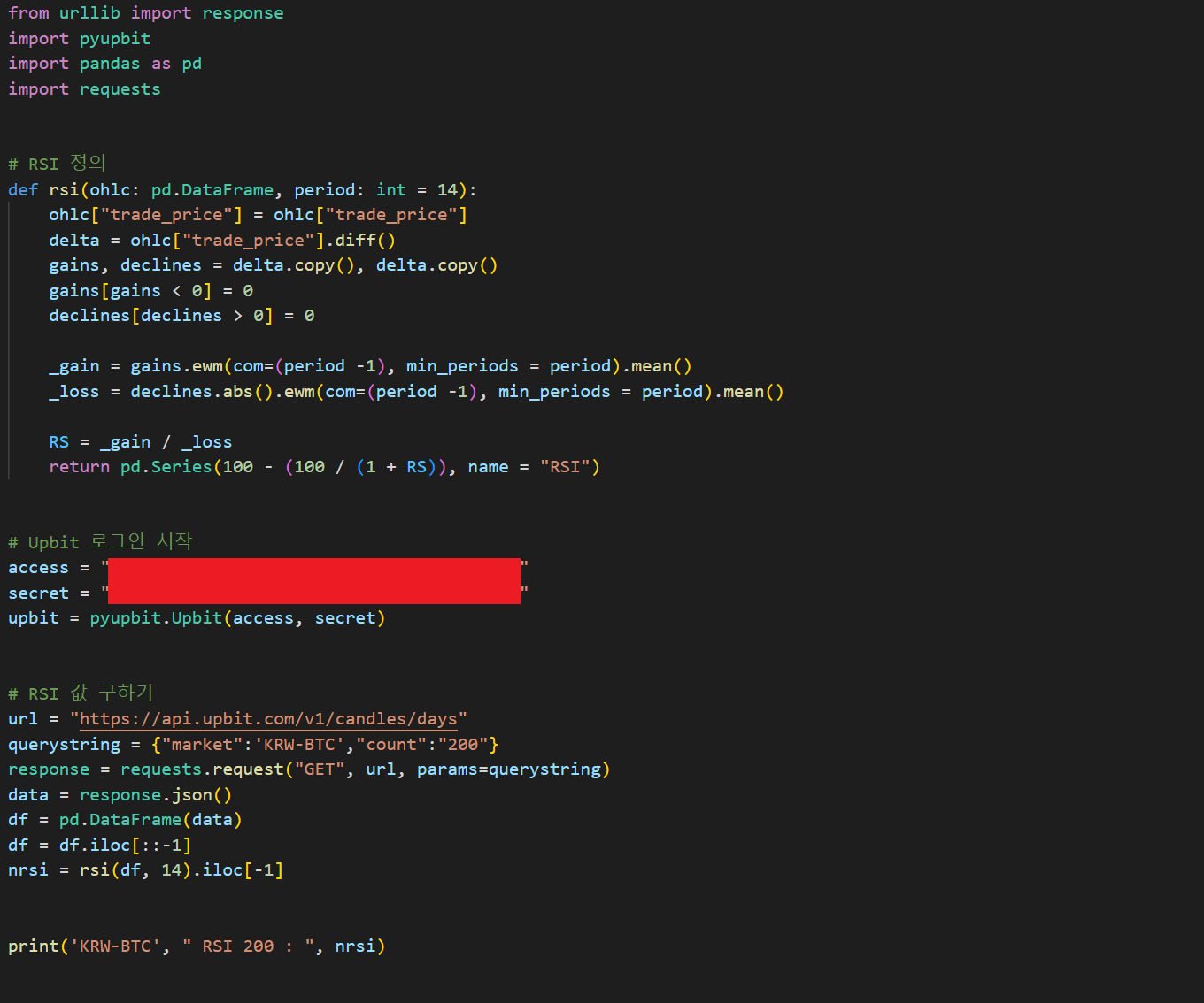 코인의 가격 데이터를 크롤링 해서 csv 파일로 저장해 놓으면, 자동매매를 하기 위해서 각종 지표들을 계산할 때 마다 매번 API를 호출하지 않아도 된다. 따라서 장기간의 데이터로 계산을 해야되는 지표들을 사용할 때, 데이터를 다운받는 시간을 줄일 수 있고, 그로 인해서 지표 계산과 매수/매도 주문이 지연되는 것도 예방할 수 있다. 아래의 코드를 실행하면, 업비트에서 KRW 마켓, BTC 마켓, USDT 마켓에서 거래 가능한 코인들의 가격 데이터를 코드가 실행되는 날짜 기준으로 과거 400일 동안의 데이터를 각 코인별로 csv 파일로 저장(400일 이상 거래된 코인에 한함)이 된다. import json import time import pandas as pd import pyupbit import ur..
